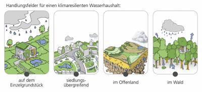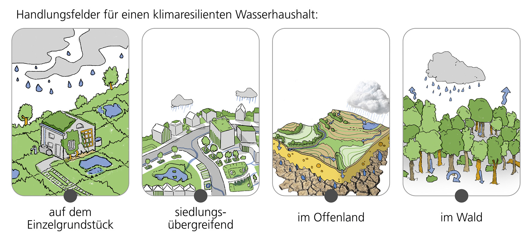 Prinzipien wie entsiegelte Flächen, trockenresistente Pflanzen, die Regenwassernutzung oder kleine Retentionsbereiche lassen sich auch im eigenen Garten umsetzen. Daher können auch Bürgerinnen und Bürger mithelfen, Wasser im Boden zu halten und ein angenehmeres Mikroklima zu schaffen.