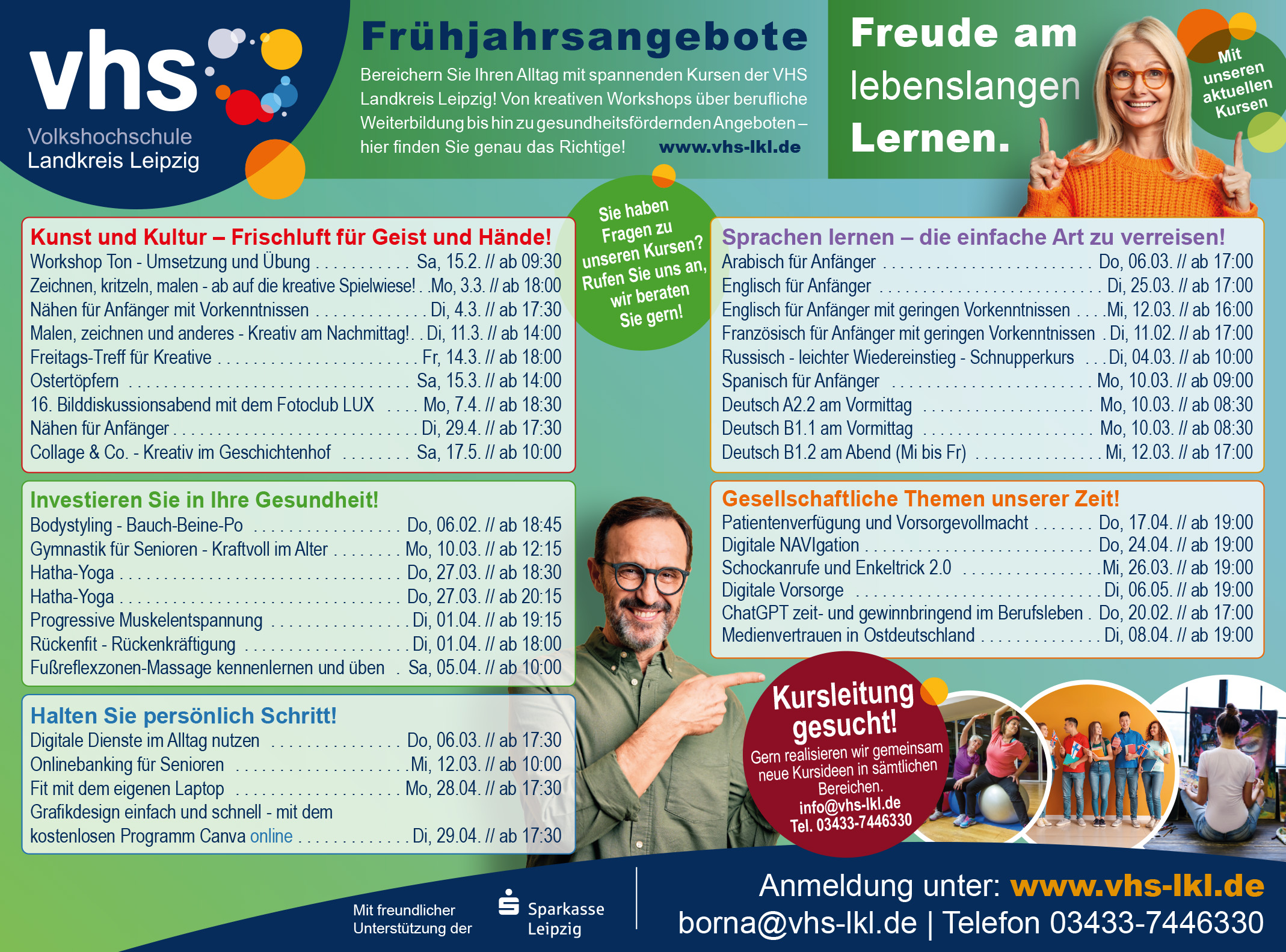 Der Februar bringt Veränderungen mit sich. Der Winter wird vertrieben und die ersten Sonnenstrahlen wecken die Natur aus dem Winterschlaf. Nutzen Sie diese Energie und lassen Sie sich von unserem abwechslungsreichen Kursangebot inspirieren. Die VHS Landkreis Leipzig bietet Ihnen die Möglichkeit, das Ende des Winters aktiv zu gestalten und sich fit für den Frühling zu machen.