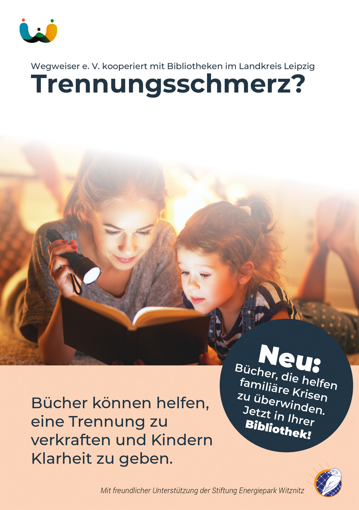Über dreißig Buchtitel fasst das Regal, welches die Bibliotheken Böhlen, Rötha, Borna, Markleeberg und Deutzen ihren Leserinnen und Lesern zur Ausleihe anbieten. Der Grund für das Projekt sind die anhaltend langen Wartelisten für Eltern, die eine Trennungsberatung oder eine Mediation anfragen. Neben den kostenlosen Online-Seminaren, die Eltern über die Homepage des Wegweiser e. V. buchen können, sind nun auch jede Menge hilfreiche Ratgeber-Bücher kostengünstig in den Bibliotheken erhältlich. Sie liefern hilfreiche Denkanstöße, Perspektivwechsel für eine kindzentrierte Erziehung und Informationen zum Umgang mit einer Trennung. Das Projekt „Ratgeberliteratur für Familien in schwierigen Lebensphasen“ wird von der Stiftung Energiepark Witznitz gefördert.