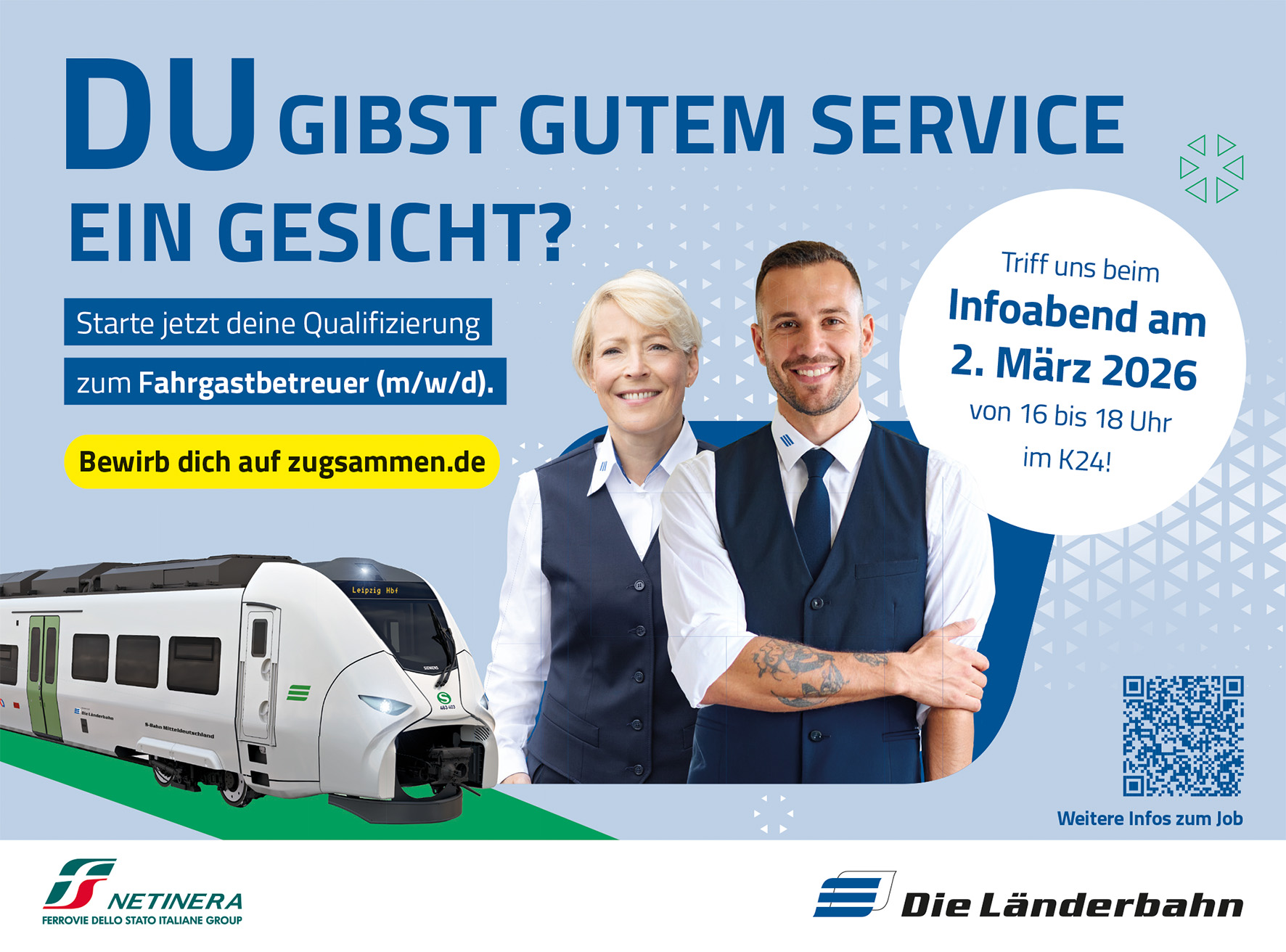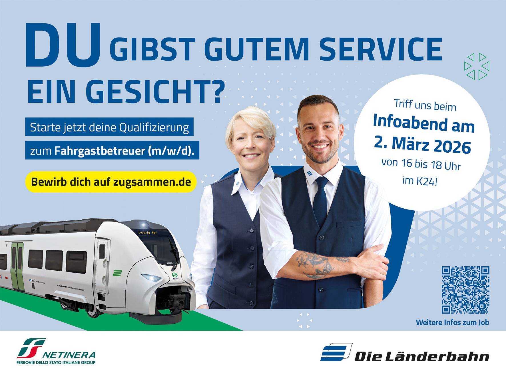 Interessierte können sich am 2. März 2026 von 16:00 bis 18:00 Uhr im K24! (Kirchstraße 24, Borna) bei einem Infoabend über das Berufsbild der Fahrgastbetreuung und die Länderbahn als Arbeitgeber informieren. Mitarbeitende und die Personalabteilung stehen für Fragen zum Einstieg und Bewerbungsprozess zur Verfügung.