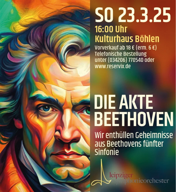 Tauchen Sie ein in die faszinierende Welt von Ludwig van Beethovens 5. Sinfonie! Im Sonderkonzert „Die Akte Beethoven“ enthüllt das Leipziger Symphonieorchester die Geheimnisse und Hintergründe eines der bekanntesten Werke der klassischen Musik. Erleben Sie, wie Beethoven mit seiner 5. Sinfonie nicht nur musikalische Grenzen sprengte, sondern auch tiefgreifende Emotionen und universelle Themen ansprach. Robbert van Steijn (GMD) wird spannende Anekdoten, historische Kontexte und musikalische Analysen präsentieren, die Ihnen neue Perspektiven auf dieses Meisterwerk eröffnen. Genießen Sie einen Nachmittag voller Musik, Wissen und Inspiration. Ob Sie ein eingefleischter Beethoven-Fan sind oder einfach nur neugierig auf die Geheimnisse der klassischen Musik – dieses Konzert ist für jeden etwas!
