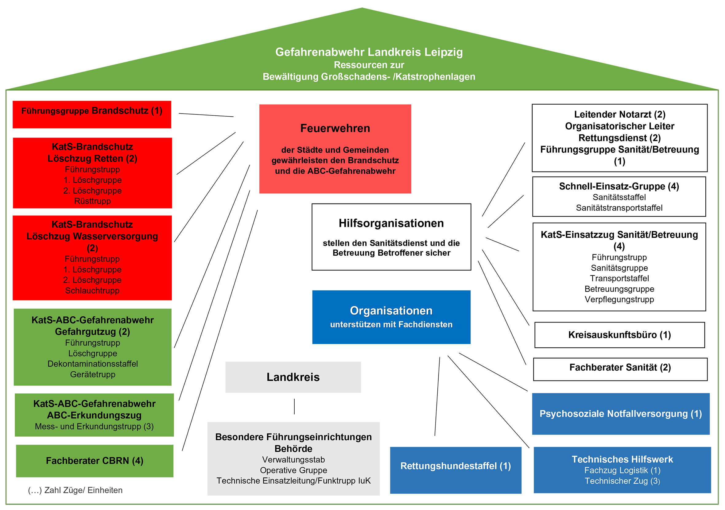 In Sachsen sind die Landkreise und kreisfreien Städte für den Katastrophenschutz zuständig. Bei uns im Landkreis Leipzig übernimmt das Amt für Brand-, Katastrophenschutz und Rettungsdienst diese Aufgabe. Dort laufen alle organisatorischen Fäden zusammen. Der Landrat trägt die Verantwortung und trifft im Ernstfall die notwendigen Entscheidungen, unterstützt durch einen Stab.