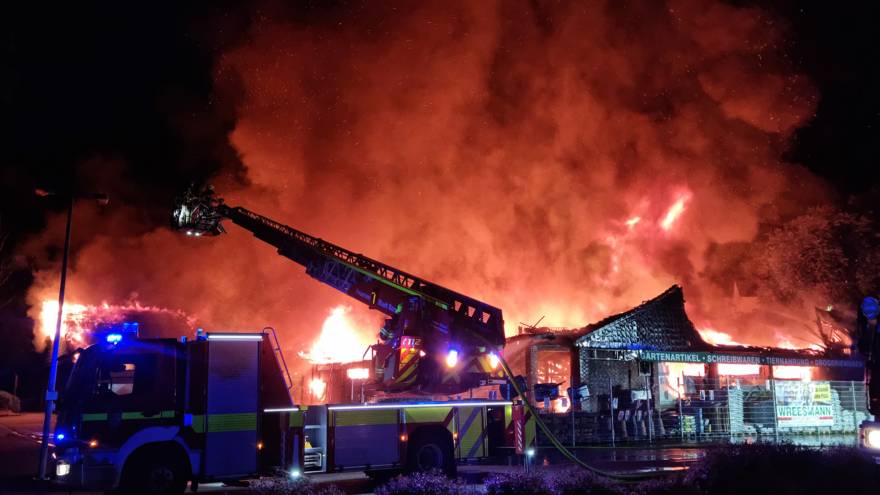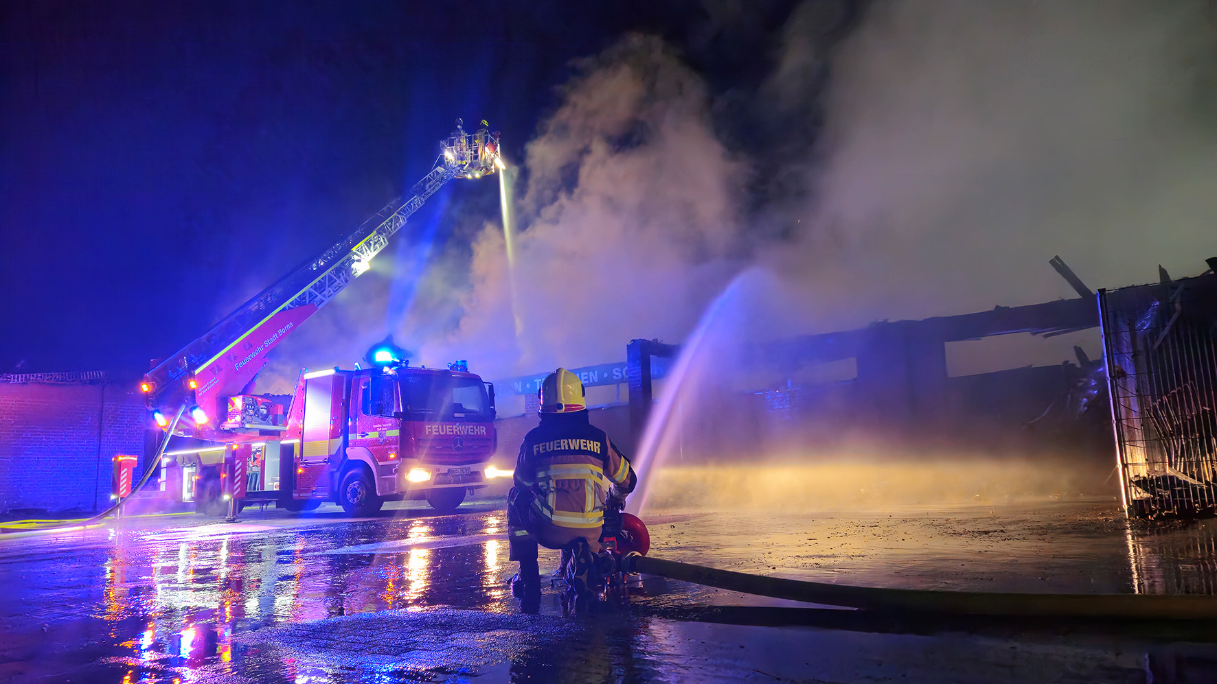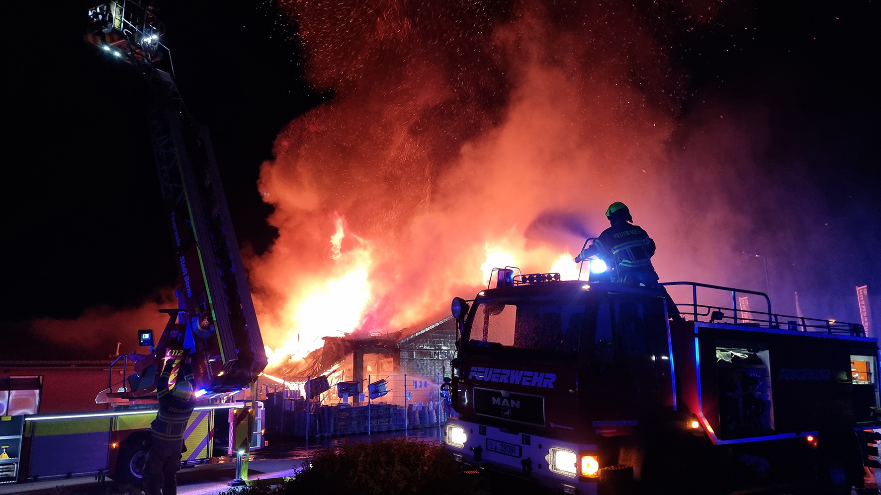Innerhalb kürzester Zeit wurde durch die zahlreichen Einsatzkräfte eine stabile Wasserversorgung aus mehreren Hydranten aufgebaut. Gleichzeitig begann ein massiver Löschangriff aus über 10 Rohren, über den Werfer des Tanklöschfahrzeuges und über 2 Drehleitern. Trotz des extremen Löschwassereinsatzes war das Gebäude nicht zu halten. Ein angrenzendes Wohngebäude wurde vorsorglich evakuiert und mit einer Riegelstellung vor der enormen Wärmestrahlung geschützt.