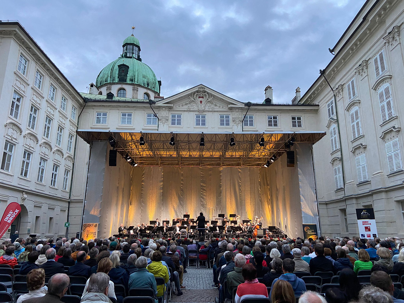 Die Sächsische Bläserphilharmonie, ausgezeichnet mit dem „OPUS KLASSIK“ 2023, ist nicht nur ein kultureller Botschafter der Region Leipzig, sondern spielte auch eine zentrale Rolle bei dieser Delegationsreise. Am Abend des 7. Juli spielten die in Bad Lausick ansässigen Bläser ihr letztes Konzert der Spielzeit 23/24 und überraschten mit einem besonderen Highlight. Die Bläserphilharmonie zählt deutschlandweit zu den 129 Kulturorchestern und ist einzigartig, da sie ausschließlich in sinfonischer Bläserbesetzung auftritt. Ihr Auftritt bei den jährlich stattfindenden Innsbrucker Promenadenkonzerten, in der historischen Innsbrucker Hofburg, bot den perfekten Rahmen für ein erstes Zusammentreffen mit eingeladenen regionalen Wirtschaftsvertretern. Der Abend begann mit einem exklusiven Empfang im Kulturrestaurant „Das Brahms“, das Kunst und Wirtschaft auf besondere Weise vereint. Der Sektempfang bot die Möglichkeit, mit ortsansässigen Unternehmen und Tiroler Wirtschaftsvertretern in Kontakt zu treten. Gemeinsam konnten die Teilnehmer des Empfangs anschließend der Uraufführung des Werks „Alpenglühen“ von Hennig Wölk, zusammen mit Solocellist Jakob Spahn, Bayrische Staatsoper, beiwohnen.