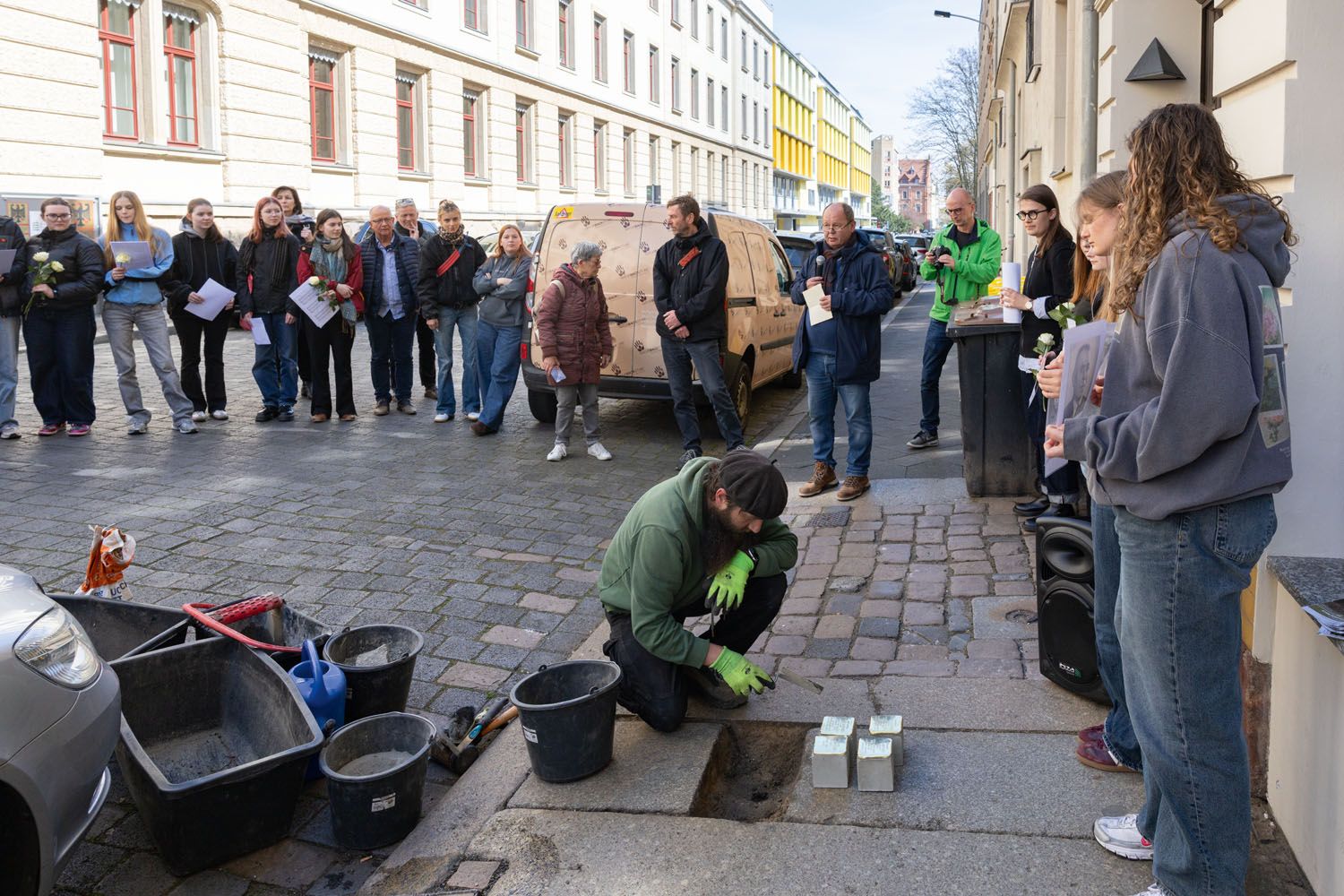 Die Verlegung der Stolpersteine erfolgte durch die AG Spurensuche in Zusammenarbeit mit Achim Beier vom Archiv Bürgerbewegung Leipzig e. V. Finanziert wurden sie durch liebe Menschen aus dem Umfeld der Schule und der AG. Sie übernahmen auch die Patenschaft der Steine.