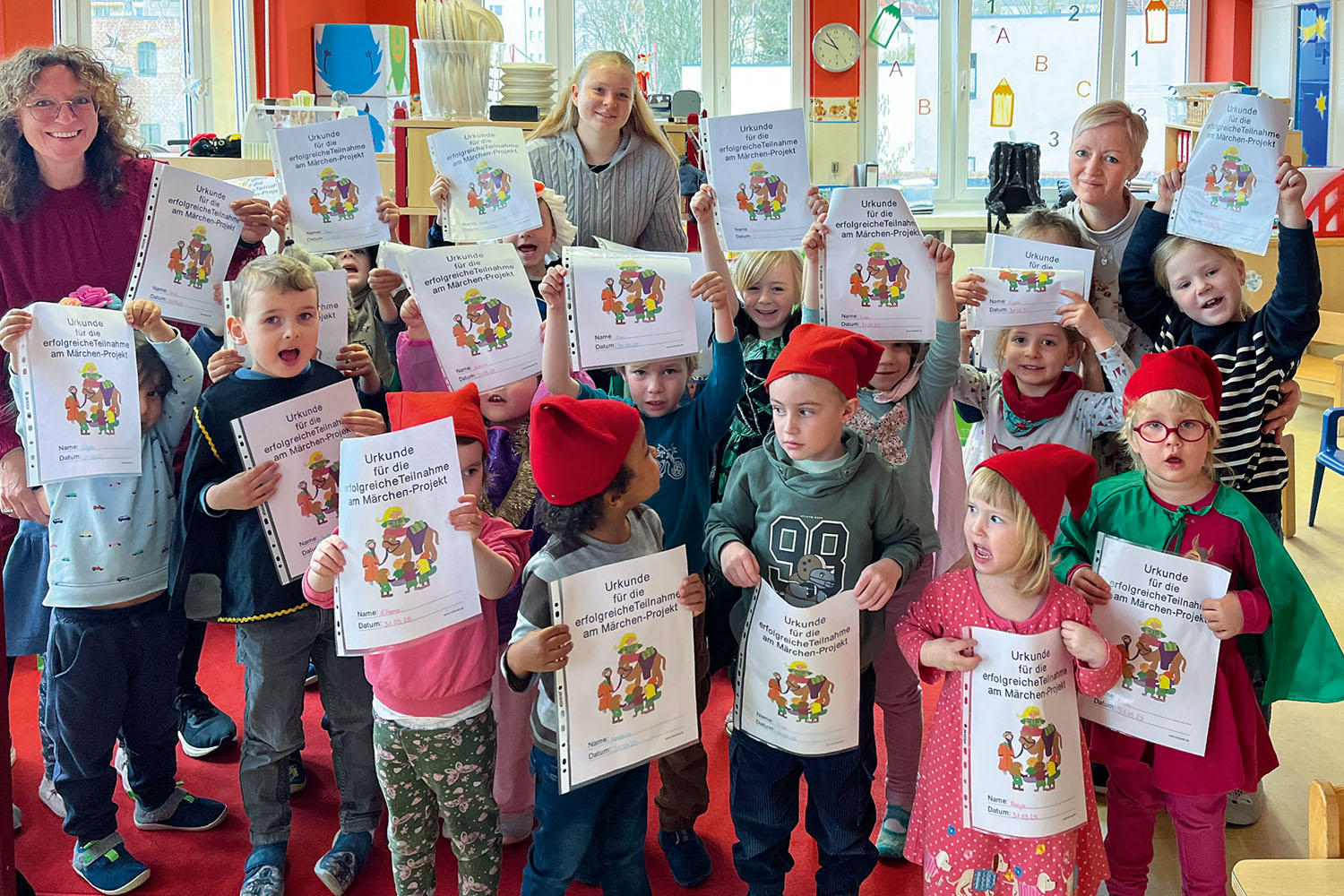 Der Höhepunkt und Abschluss des Projektes war ein gemeinsamer Eltern-Kind-Nachmittag. Voller Begeisterung probten die Kinder viele Tage zuvor. Jeder bekam eine Rolle: Schneewittchen, das tapfere Schneiderlein, Dornröschen, Hase und Igel und viele weitere Figuren kamen zu märchenhaften Liedern zum Einsatz. Zwischendurch bekamen die Eltern Märchenrätsel von den Kindern gestellt. Nun mussten die Erwachsenen ihr Wissen unter Beweis stellen und zeigen, ob sie sich im Märchenland auskennen. Es war ein aufregender gelungener Nachmittag für Groß und Klein mit Lampenfieber und Erfolgserlebnissen der Jüngsten. Am Ende des Projektes bekamen alle Kinder eine Märchenexperten – Medaille und eine Urkunde zur erfolgreichen Teilnahme am Projekt. Stolz präsentierten sie dies. Nun sind wir auf die nächsten Höhepunkte gespannt.