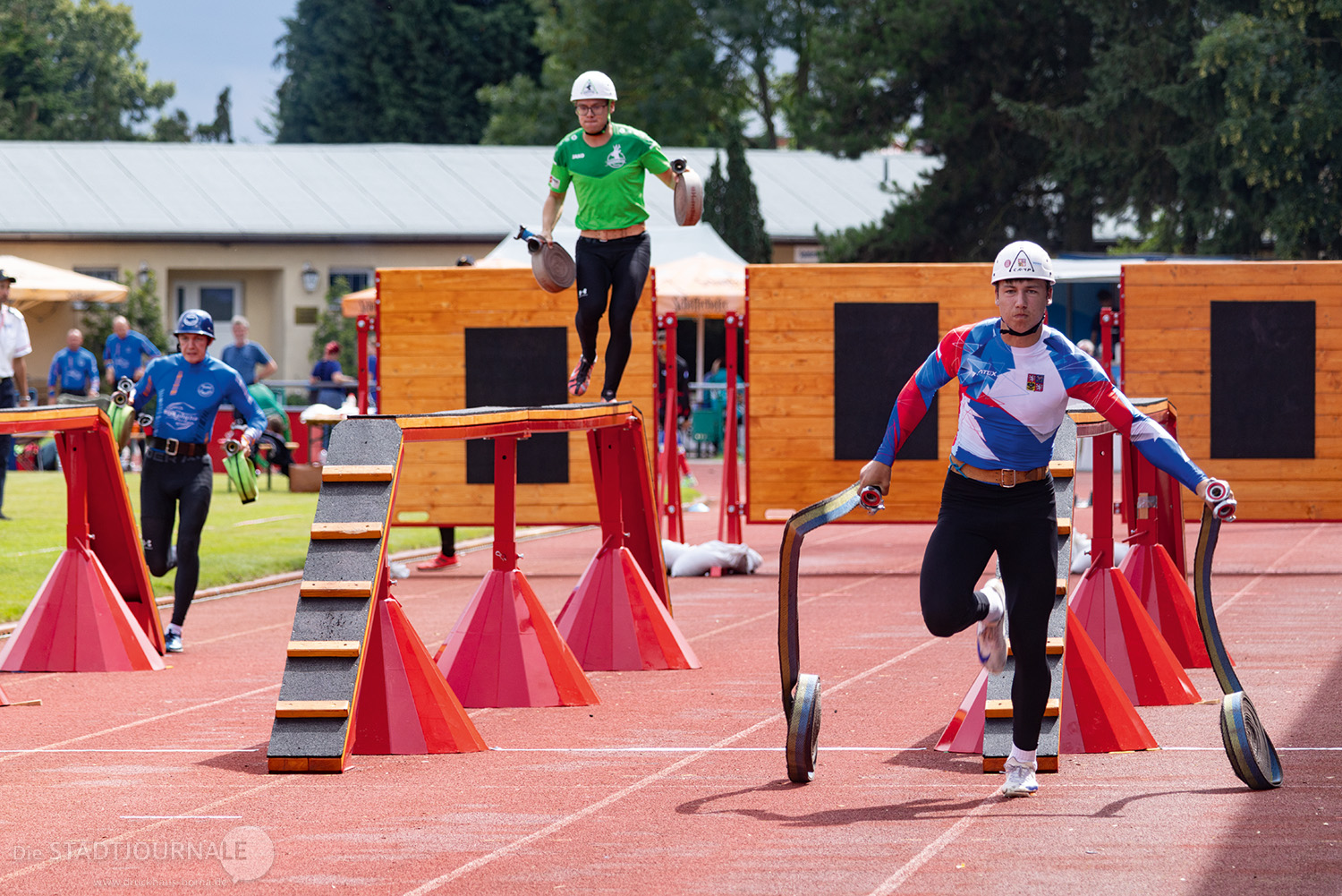 In der „4-mal-100-Meter-Hindernisstaffel“ der Männer errang Jonas Mäde aus Brandis mit dem Team „Sachsen B“ die Bronzemedaille. Er und seine drei Teamkollegen mussten eine Stadionrunde absolvieren, dabei im vollen Sprint über einen Schwebebalken balancieren, eine Wand überklettern und über ein Hausdach rennen. Und natürlich ein Feuer löschen!