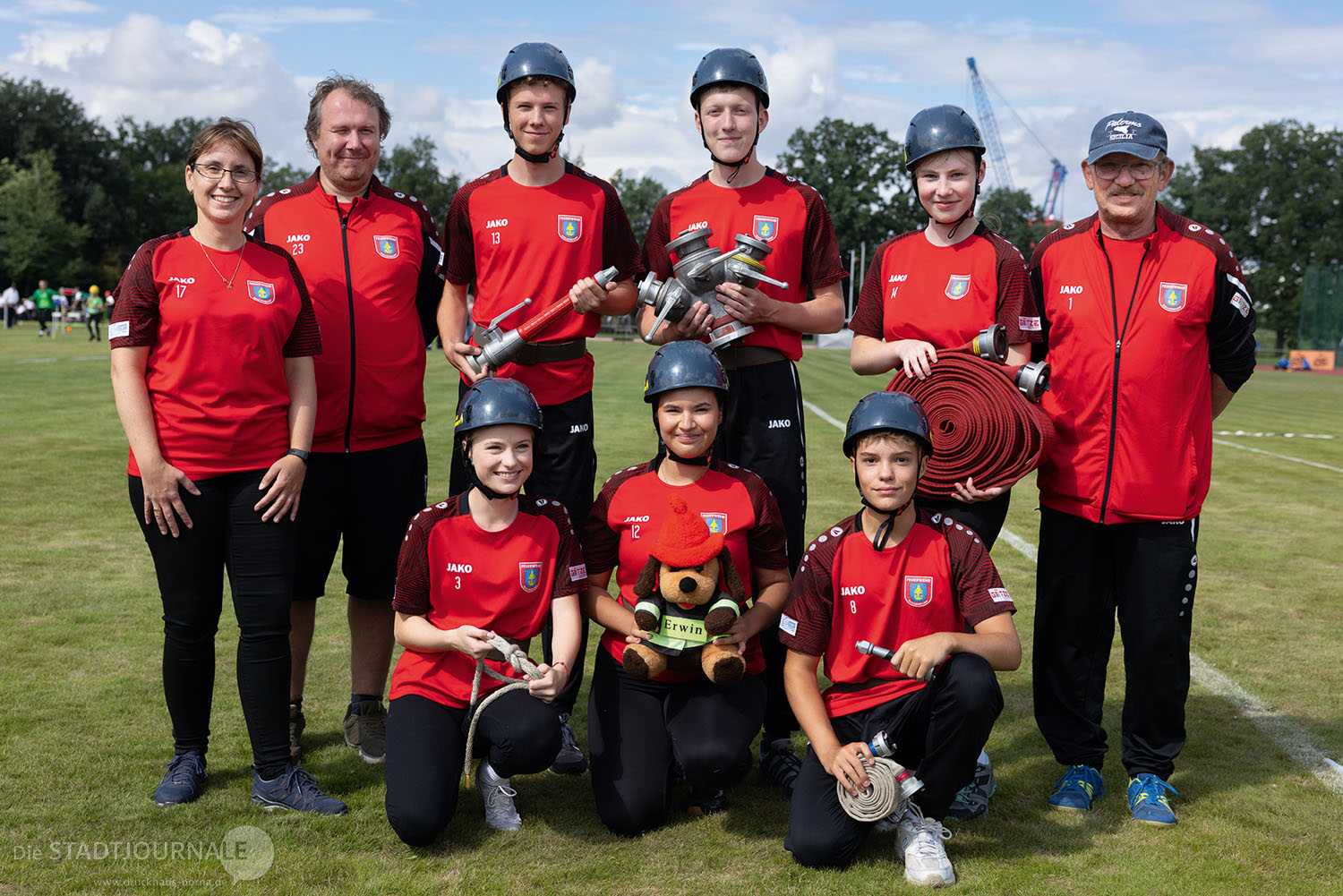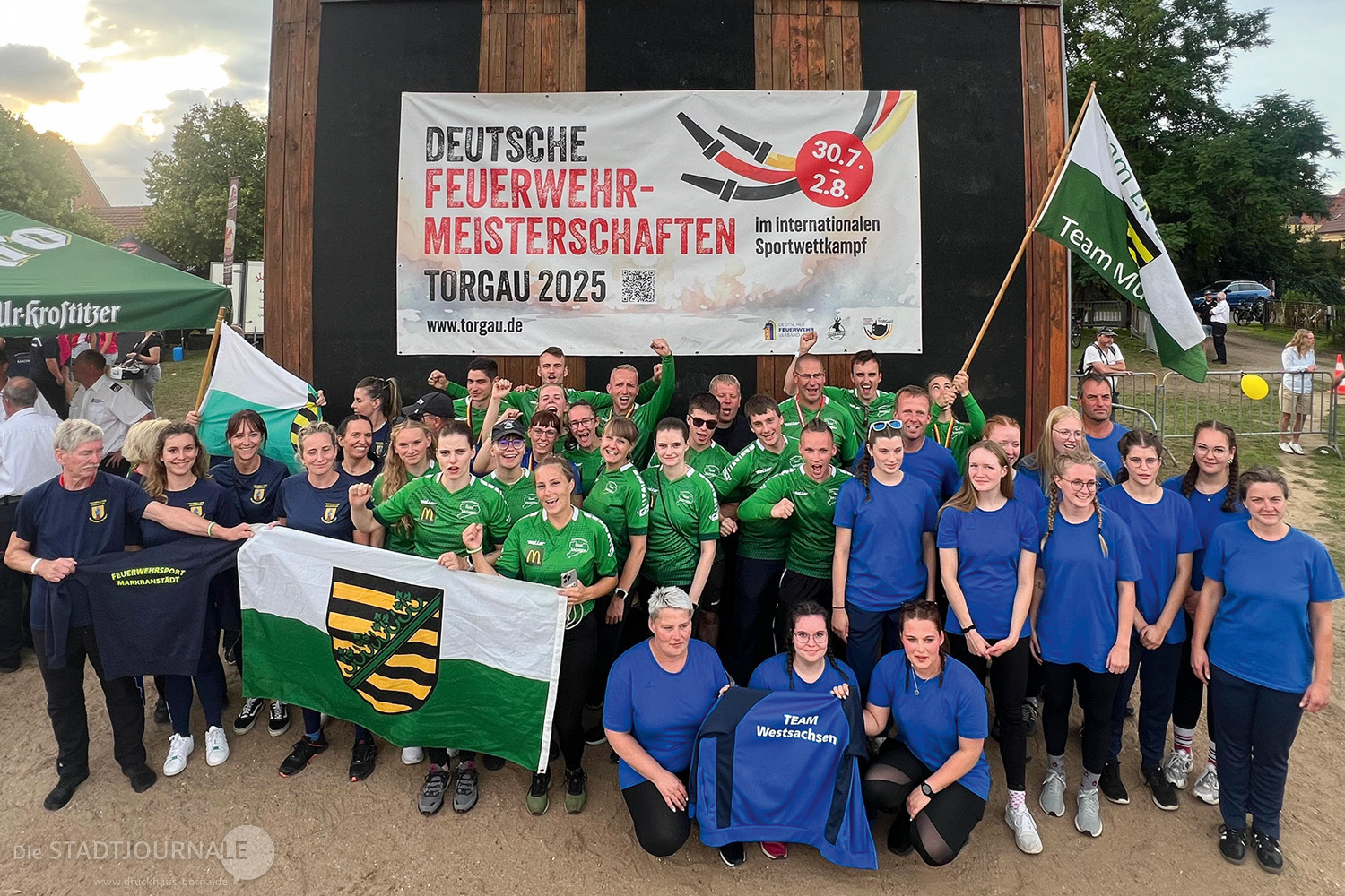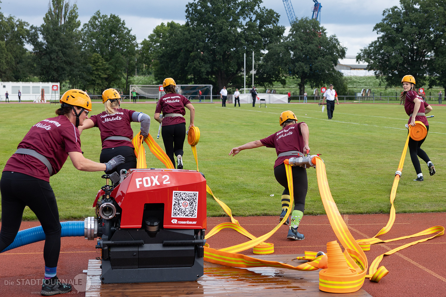 Mit dabei waren Athleten aus dem Landkreis Leipzig, darunter das Frauenteam aus Markranstädt, das in der Disziplin „Löschangriff nass“ antrat. Dabei musste eine Pumpe an ein Wasserreservoir angeschlossen und gleichzeitig ein Schlauchsystem aufgebaut werden, um das Wasser ans andere Ende des Sportplatzes zu bringen. Das Siegerteam brauchte nicht mal 21 Sekunden dafür!