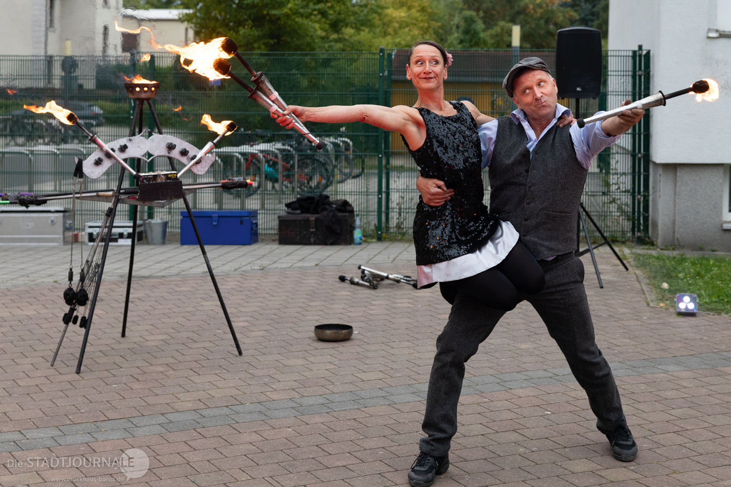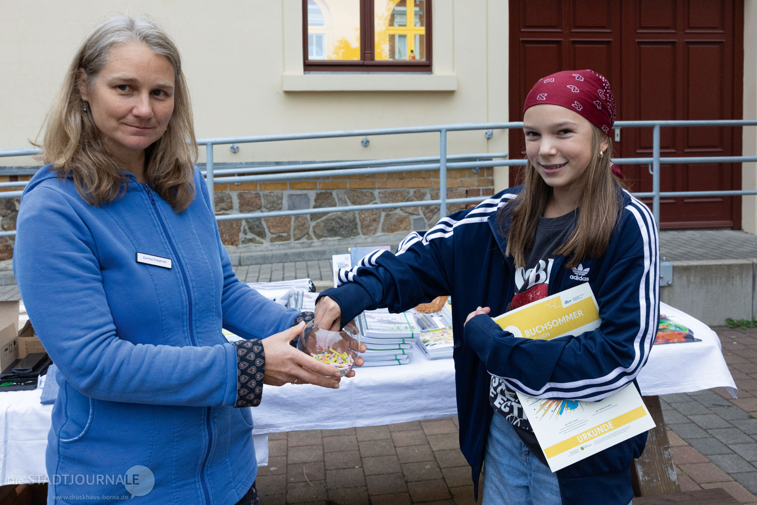 Zum Abschluss des diesjährigen Buchsommers trafen sich die Teilnehmenden, Familien und Freunde zu einer Party auf dem Schulhof der Oberschule. Zahlreiche Kinder und Jugendliche hatten sich an der kostenfreien Sommerferienaktion beteiligt und durch Bücher aller Genres gelesen. Dafür konnten sie eine Leseurkunde in Empfang nehmen und eine tolle Feuershow der Gruppe „Inflammati“ erleben. Mit einer Tombola und einem gemütlichen Beisammensein am Buffett fand der Buchsommer 2025 einen würdigen Abschluss.
