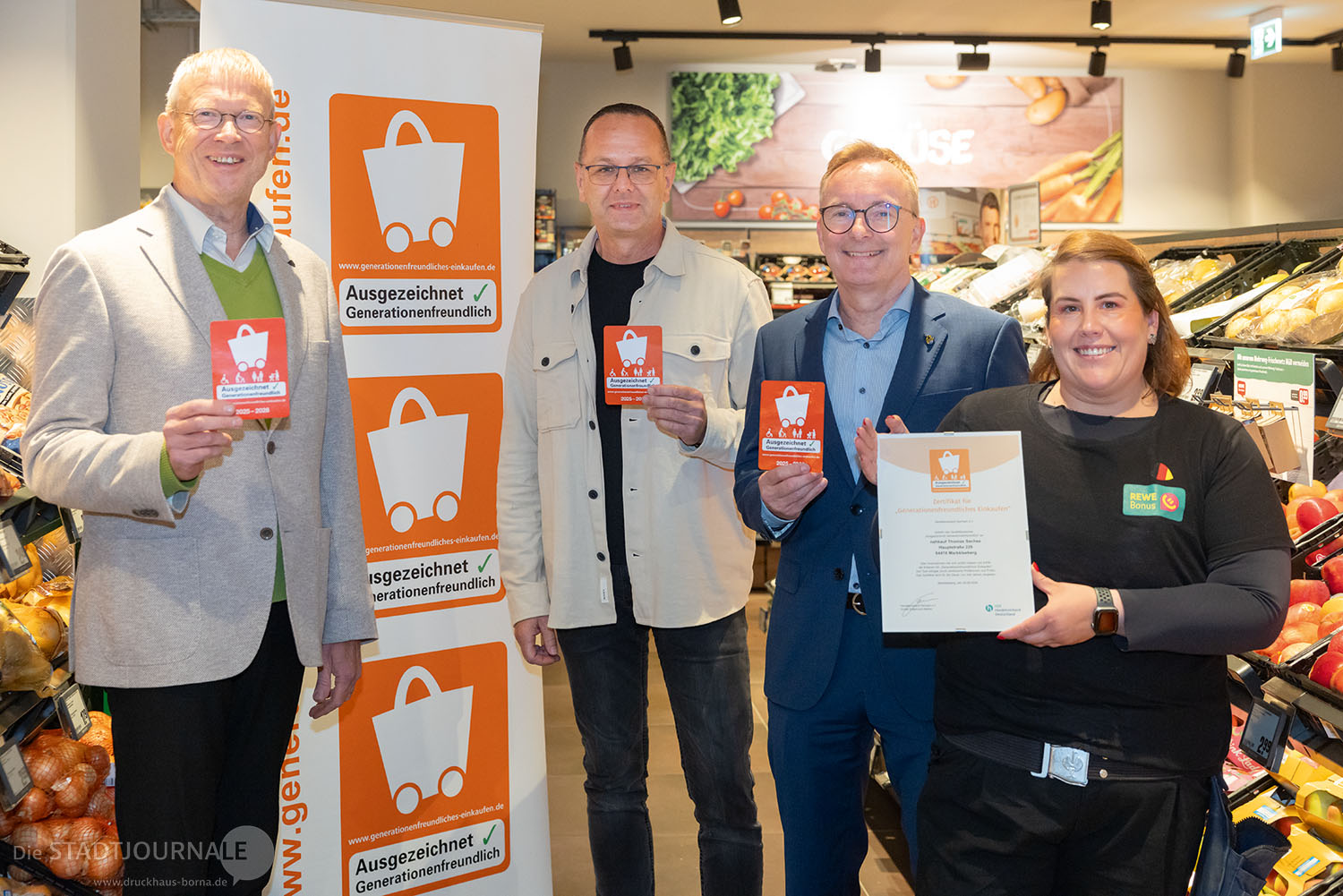 „Wir freuen uns sehr über diese Auszeichnung. In dem schönen Neubau der Wohnungsbaugesellschaft Markkleeberg (WBG) können wir unser Angebot nicht nur erweitern, sondern auch schöner präsentieren und die Standards für generationenfreundliches Einkaufen umsetzen“, sagt Marktinhaber Thomas Sachse. Olaf Schlegel, Bürgermeister und Geschäftsführer der WBG, ergänzt: „Wir haben hier viele ältere Mieter. Für die ist es natürlich wichtig, dass sie auch mit dem Rollator oder mit Einschränkungen ohne Probleme einkaufen können.“
