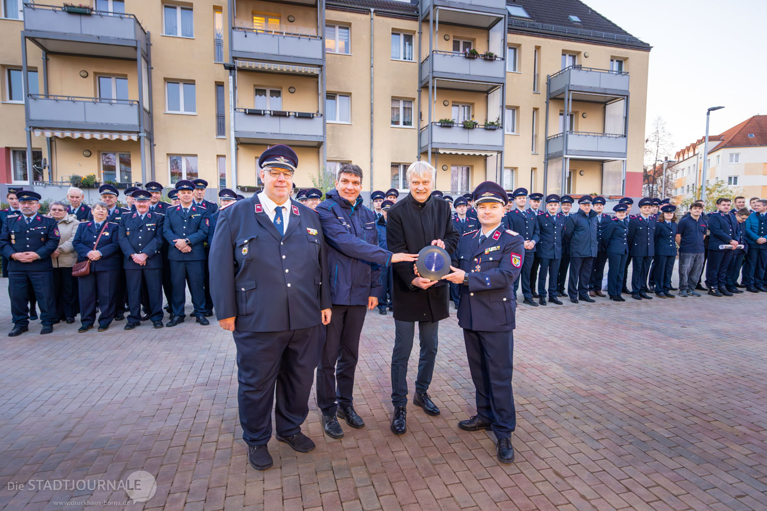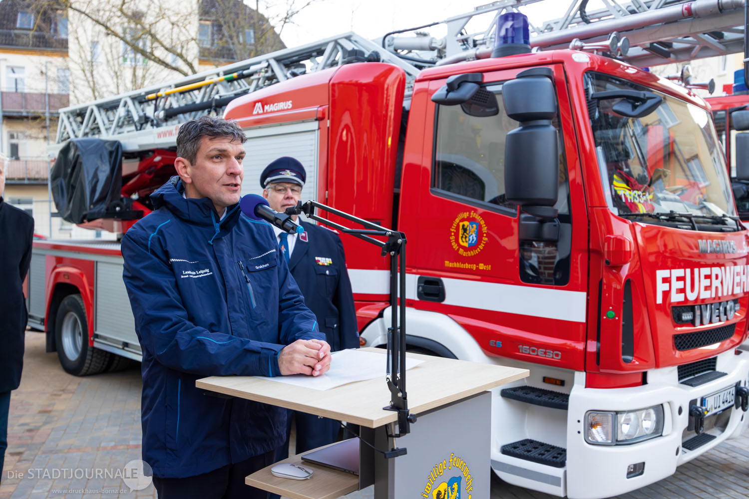 Landrat Graichen, der ebenfalls der Übergabe beiwohnte, ging auf die stattliche Einsatzzahl der Feuerwehren Markkleebergs ein. In diesem Jahr waren es bereits 196 Einsätze, welche sie absolvierten. Viele davon waren Brände auf der Deponie Cröbern. Bei jenen entzündeten sich oft die Akkus. „Nicht zu unterschätzen sind die Einsätze auf den Autobahnen A 38 und A 72“, so der Landrat weiter in seiner Ansprache. „Deshalb ist es wichtig, dass Markkleeberg eines der modernsten Feuerwehrgerätehäuser mit viel Platz für moderne Fahrzeuge hat.“ Sowohl dem Oberbürgermeister als auch dem Landrat war es wichtig, ihre Hochachtung gegenüber den Einsatzkräften auszusprechen, allzumal es eine Freiwillige Feuerwehr ist, welche solche enormen und gefährlichen Einsätze absolviert.