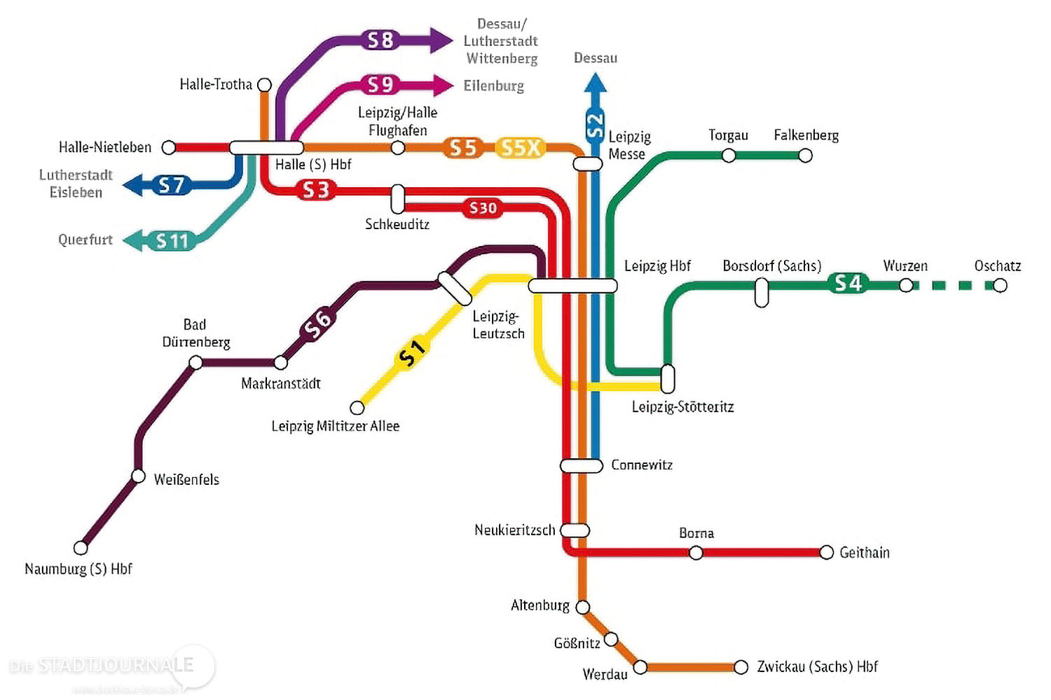 S3: Halle-Nietleben – Leipzig – Geithain, S30: Leipzig – Schkeuditz: Die S3 fährt künftig nach Borna (Geithain). Die neue Linie S30 fährt von Leipzig Hauptbahnhof (oben) und Schkeuditz.