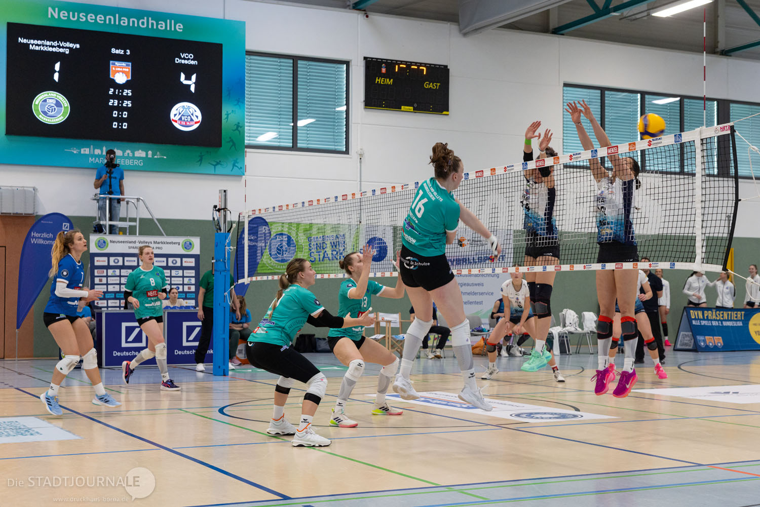 Satz 2 sollte nun die Wende bringen, doch er ging leider zunächst „nach hinten los“. Zwei frühe Auszeiten von Tim Reichenbach bei 2:6 und 3:9 änderten erstmal auch nichts an der klaren Führung der Dresdnerinnen von bis zu fünf Punkten. Doch ab der Satzmitte wurden unsere Mädels wieder stabiler und bei den Gästen schlichen sich dann doch auch mal ein paar Fehler ein. Der Punktrückstand verringerte sich so kontinuierlich und bei 23:23 war sogar der Ausgleich geschafft. Aber leider versäumten es unsere Mädels dann, sich mit dem Satzgewinn zu belohnen. Ein dankbar angenommenes Annahmegeschenk und ein Hammerangriff brachten den Gästen leider den denkbar knappen 25:23-Satzerfolg.