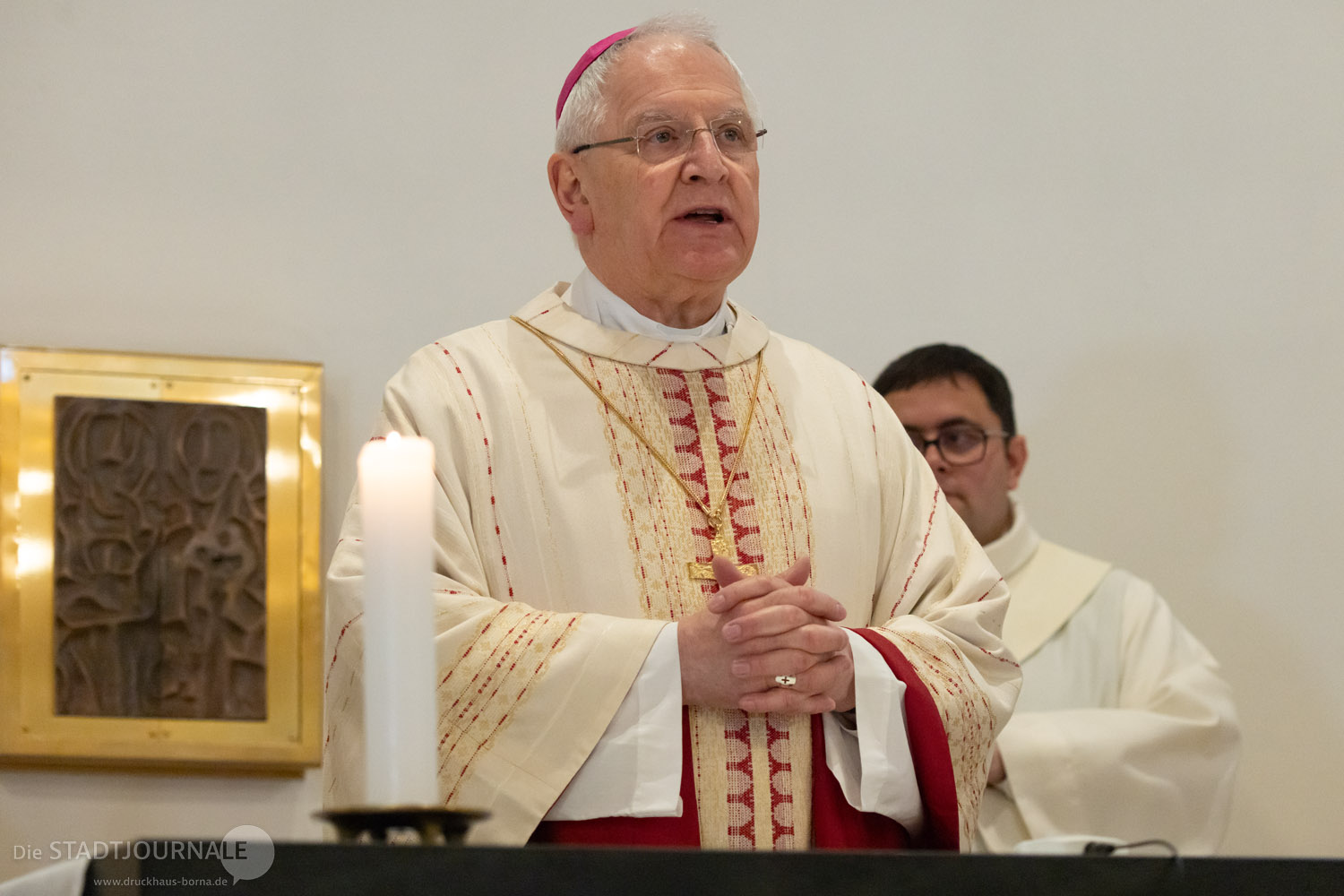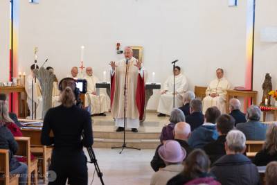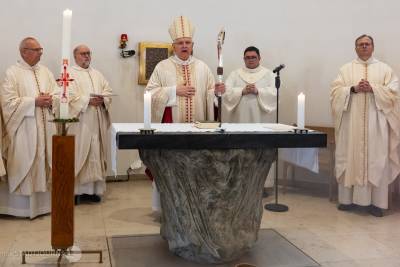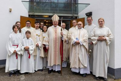 In seiner Predigt ermutigte Bischof Heinrich die Gemeinde, einerseits dankbar auf das Geschenk ihrer Kirche zu schauen, aber sich gleichzeitig auch mutig den neuen, sich ständig verändernden Zeiten zu stellen. Sich dafür in dieser Kirche durch Gebet, das Hören auf Gottes Wort und den Empfang der Sakramente stärken und zurüsten lassen sei Sinn und Zweck dieses Hauses. „Der Auferstandene wirkt, auch wenn wir ihn nicht immer sehen – hier in ihrer Stadt, in ihrer Pfarrei, in unserem Leben!“ so Bischof Timmerevers. Er ermutigte ausgehend von der wachsenden Zahl derer, die auch in unserem Bistum nach der Taufe fragen, Türen und Fenster offen zu halten, damit Menschen die frohe Botschaft für ihr Leben aufnehmen können.