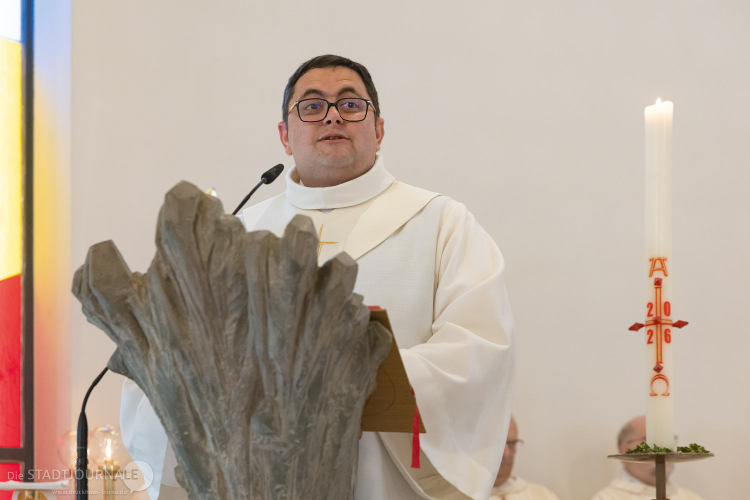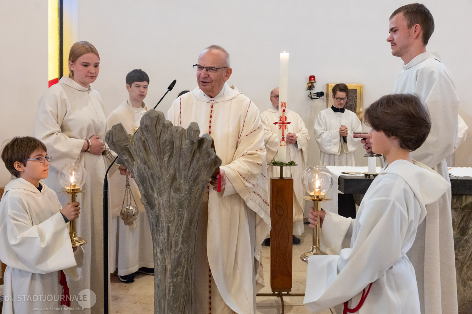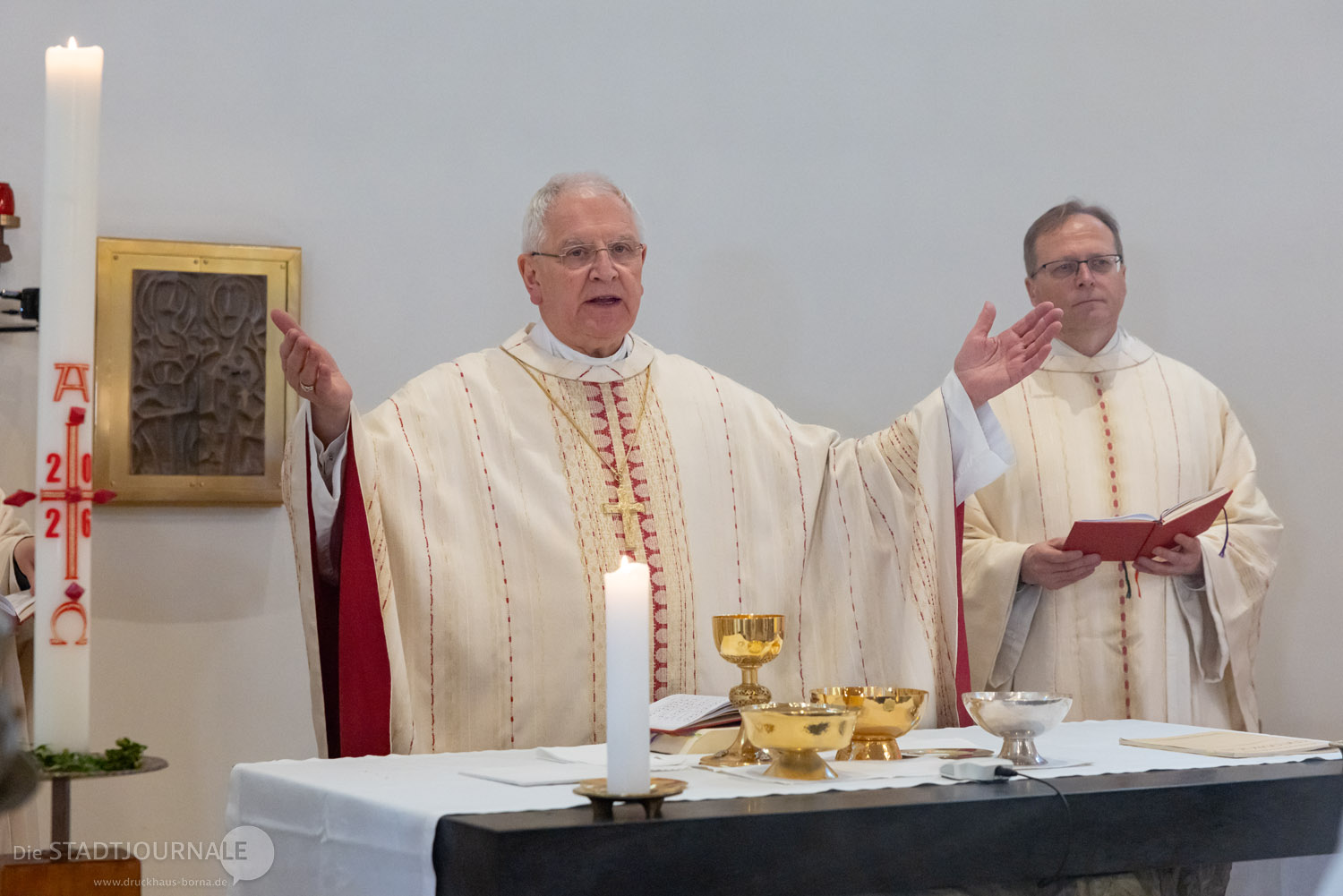 Am vergangenen Sonntag, 19. April 2026 durfte die katholische Gemeinde St. Peter und Paul in Markkleeberg das 25. Jubiläum der Weihe ihrer Kirche feiern. Viel wurde im Vorfeld erdacht, geplant und vorbereitet – doch die Wetterprognose für den Kirchweihsonntag trieben den beiden Hauptorganisatoren, Matthias Plum (Vorsitzender des Ortskirchenrates) und Gemeindereferent Matthias Demmich den Schweiß auf die Stirn. Und tatsächlich meinte es der Himmel dann auch etwas zu gut, schickte er doch reichlich „Weihwasser“ herab. Die etwa 200 Gottesdienstbesucher aber nahmen den teils heftigen Regen mit erstaunlichem Humor. Die Kirche, deren Weihefest zu feiern war, steht unter dem Patronat der Apostelfürsten Petrus und Paulus. Humorvoll fragte ein Gemeindemitglied, ob man in den letzten 25 Jahren vielleicht den Heiligen Paulus etwas zu wenig beachtet habe und dies Wetter nun die „Quittung“ dafür sei.