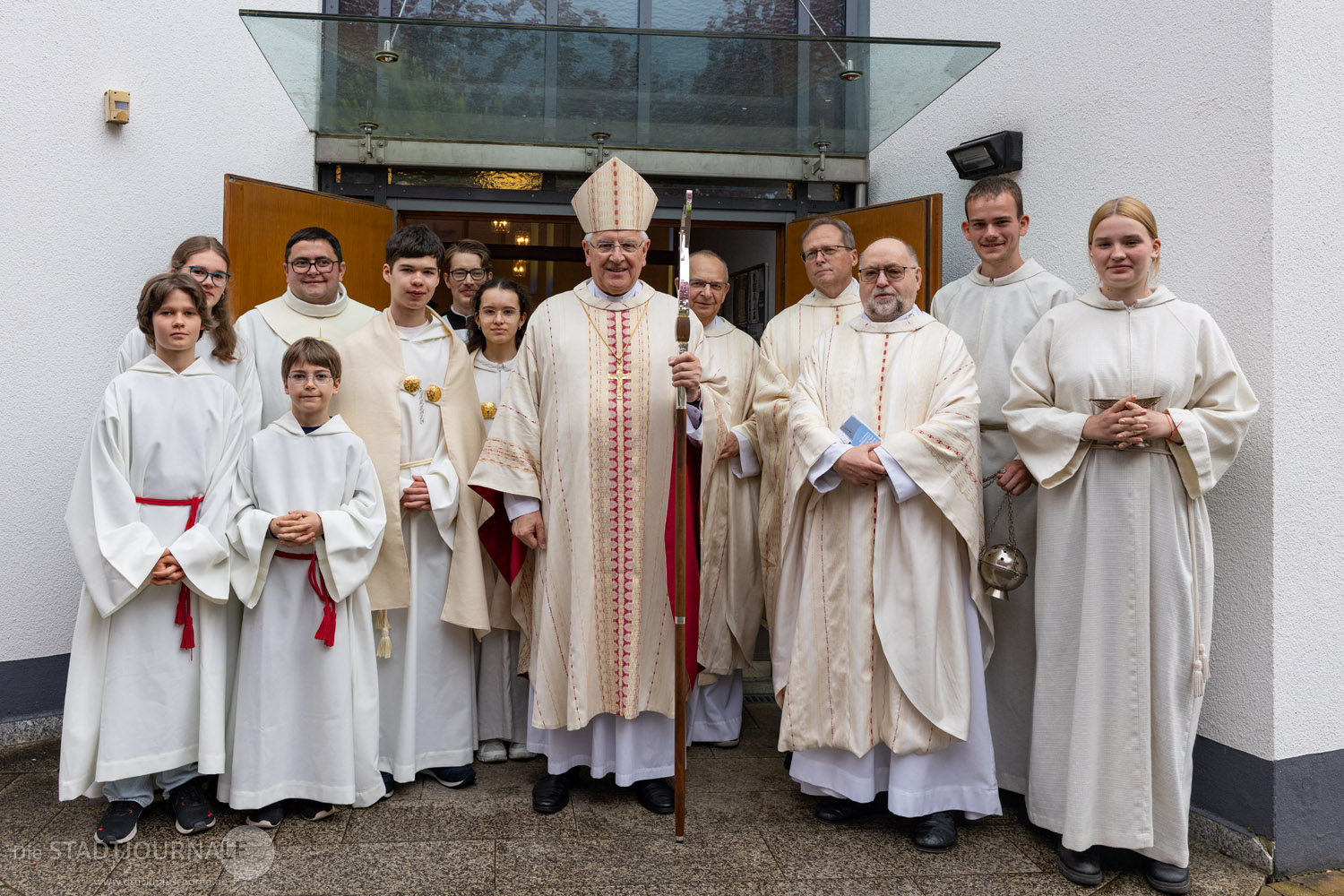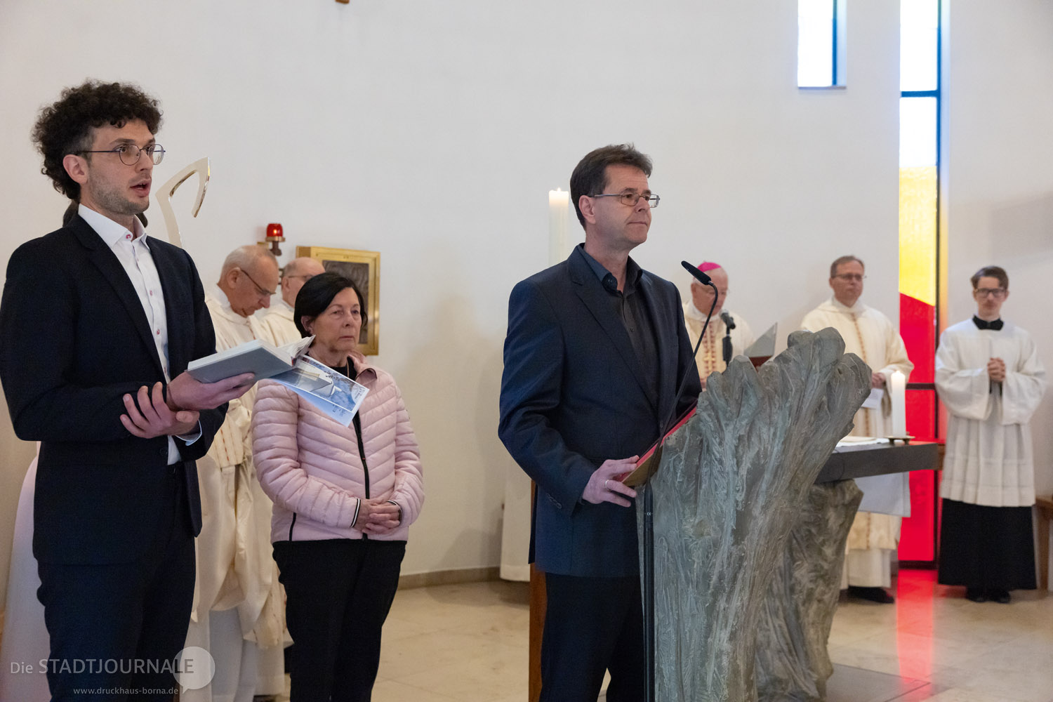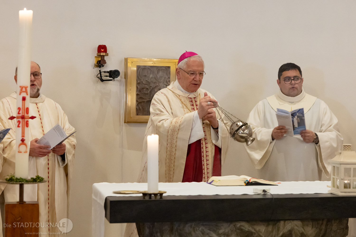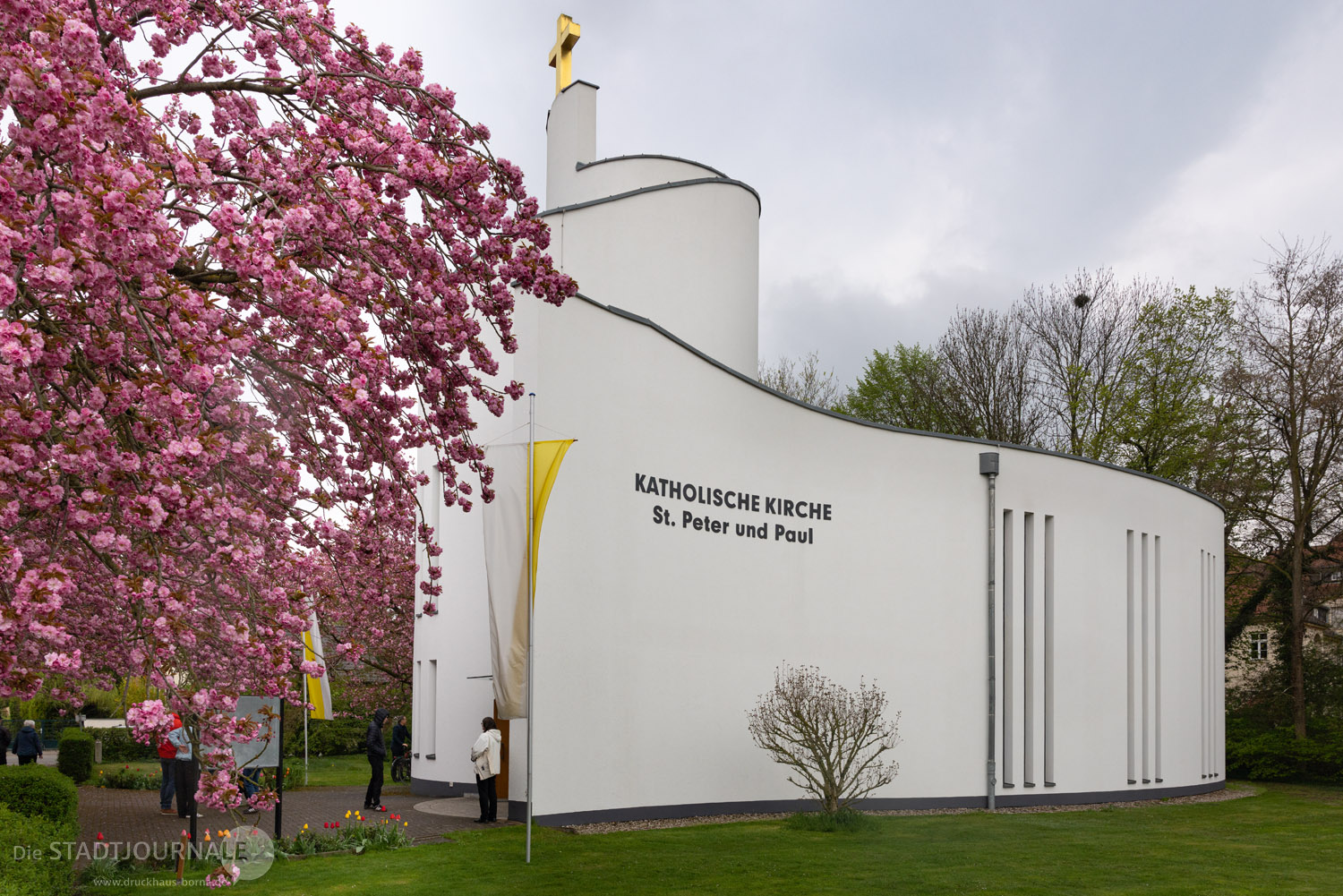 Am vergangenen Sonntag, 19. April 2026 durfte die katholische Gemeinde St. Peter und Paul in Markkleeberg das 25. Jubiläum der Weihe ihrer Kirche feiern. Viel wurde im Vorfeld erdacht, geplant und vorbereitet – doch die Wetterprognose für den Kirchweihsonntag trieben den beiden Hauptorganisatoren, Matthias Plum (Vorsitzender des Ortskirchenrates) und Gemeindereferent Matthias Demmich den Schweiß auf die Stirn. Und tatsächlich meinte es der Himmel dann auch etwas zu gut, schickte er doch reichlich „Weihwasser“ herab. Die etwa 200 Gottesdienstbesucher aber nahmen den teils heftigen Regen mit erstaunlichem Humor. Die Kirche, deren Weihefest zu feiern war, steht unter dem Patronat der Apostelfürsten Petrus und Paulus. Humorvoll fragte ein Gemeindemitglied, ob man in den letzten 25 Jahren vielleicht den Heiligen Paulus etwas zu wenig beachtet habe und dies Wetter nun die „Quittung“ dafür sei.