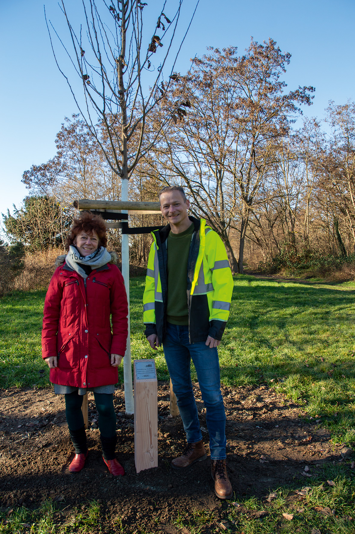 Junge Bäume sind sehr empfindlich und bedürfen einer besonders aufmerksamen Pflege, um langfristig gesund zu wachsen. Das betrifft vor allem die Wassergabe in den ersten zwei bis drei Jahren. Der Fokus liegt hier auf Regelmäßigkeit und einer ausreichenden Menge. Um neben der eigentlichen Pflanzung beides zu gewährleisten, hat die Städtische Werke Borna Netz GmbH damit eine Fachfirma (Garten- und Landschaftsbau Reszewski) beauftragt. Die kleine Informationstafel wurde mit handwerklichem Geschick von Menschen mit Handicap der Lebenshilfe Borna e. V. hergestellt.