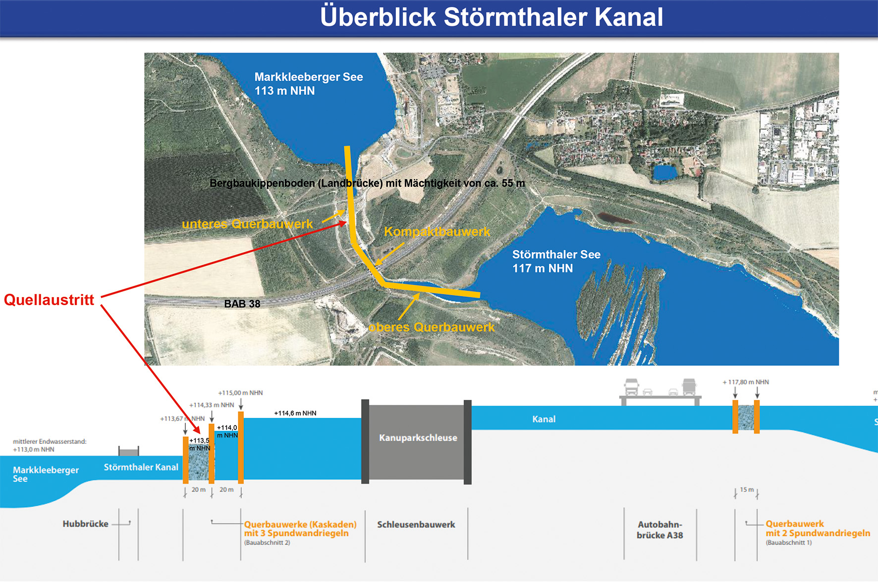 Damals wurden im Bereich der Schleuse Risse und Unterspülungen festgestellt. Ein Gutachten zeigte, dass mehrere ungünstige Faktoren zu den Problemen geführt hatten. So ist das Grundwasser im Bereich des Kanals, insbesondere auf der Seite des Markkleeberger Sees, um etwa zwei Meter stärker angestiegen als prognostiziert. Außerdem hat sich das Schleusenbauwerk weniger stark abgesenkt als erwartet, sodass die Verdichtung des lockeren Kippenbodens geringer ausfiel. Die Ursachen sind generell multikausal.