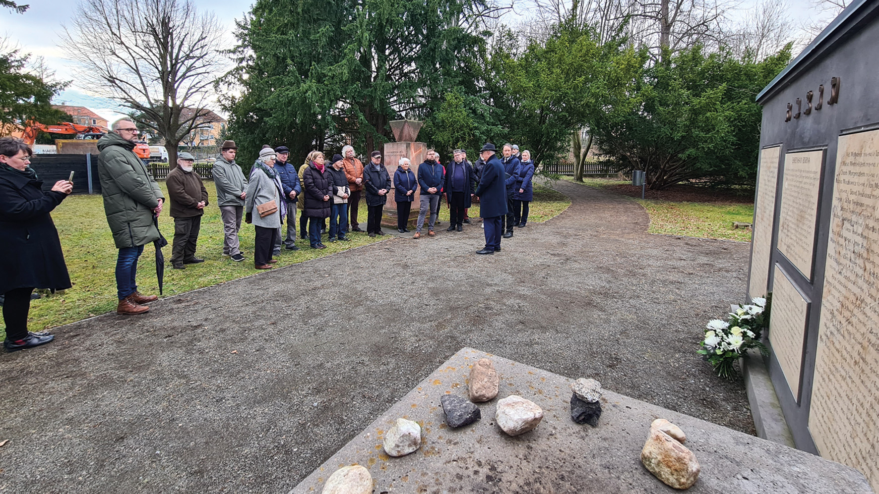 Im Auftrag der Rüstungsfirma Hugo Schneider Aktiengesellschaft (HASAG) wurden 1944 150 jüdische Häftlinge aus Buchenwald zur Herstellung von Panzerfäusten gezwungen. Außerdem mussten die Häftlinge Bomben entschärfen. Insgesamt durchliefen 1.904 Menschen das KZ-Außenlager. 235 kamen davon ums Leben. Im März 1945 wurden die Toten in Massengräbern im Wald nahe Flößberg vergraben. Nach Kriegsende wurde ein Teil der Toten von den Alliierten auf einen Friedhof in Borna umgebettet. Jener existiert noch in der Lobstädter Straße. Oberbürgermeister Oliver Urban, der Katholische Pfarrer Markus Scholz und der evangelische Pfarrer Dr. Reinhard Junghans riefen zum gemeinsamen Gedenken auf. Dabei wurden nach jüdischen Glauben Steine (ein Zeichen der Ewigkeit und als Zeichen der Ehre für die Toten) auf den Grabstein gelegt, Pfarrer Scholz mahnte in seiner Rede, dass wir wieder lernen müssten zufriedener zu sein und das Verbote nicht der Weg zur Versöhnung sein würden.