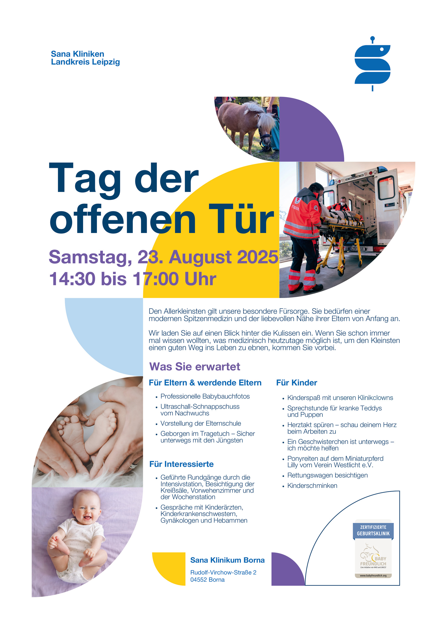Die Fachabteilung Frauenheilkunde und Geburtshilfe des Sana Klinikums Borna lädt am Samstag, 23. August 2025 zu einem Tag der offenen Tür ein. Die Besucherinnen und Besucher erwartet ein buntes Programm für die ganze Familie.