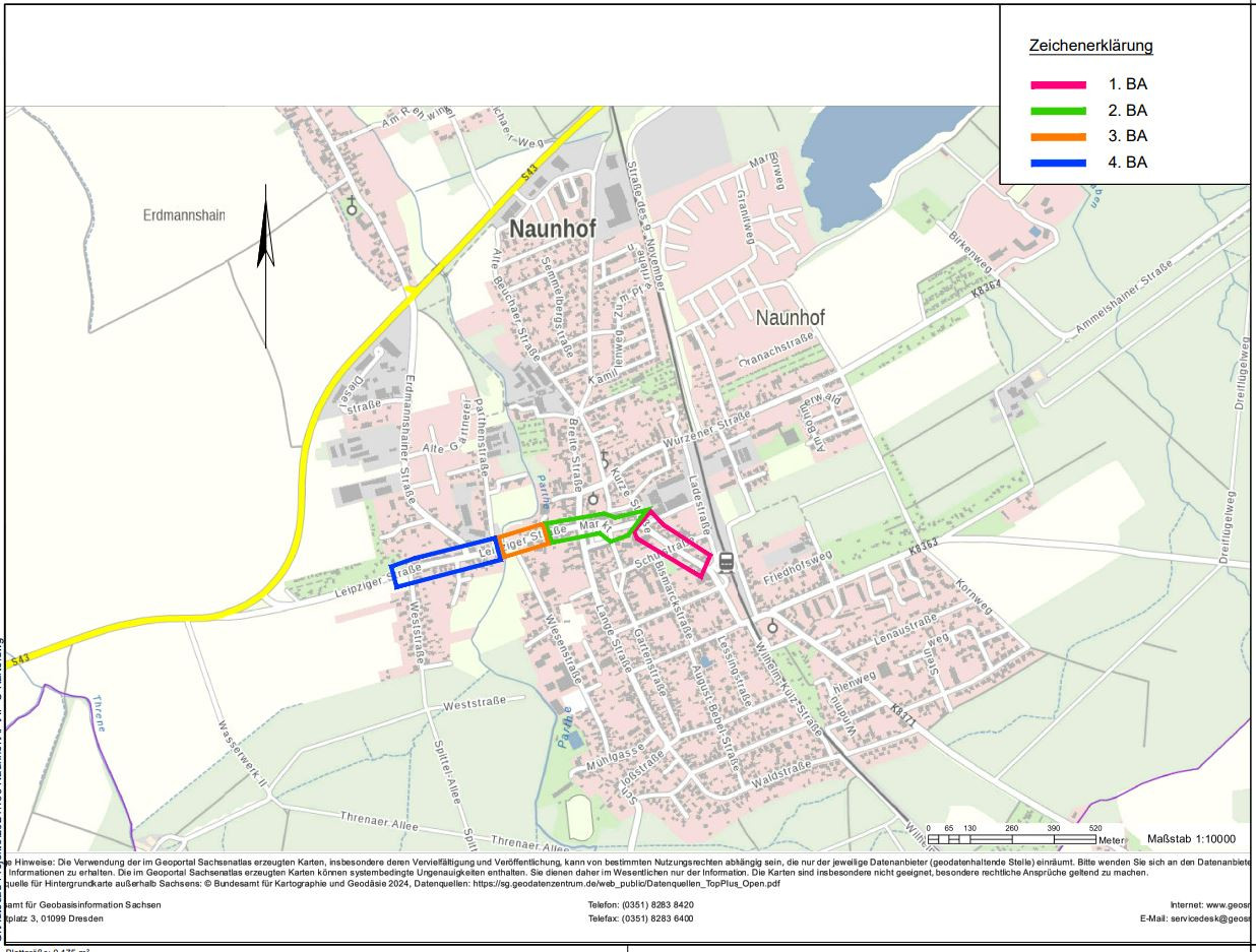 Der Ausbau erfolgt in vier Teilabschnitten bis voraussichtlich Ende 2026, wobei der 1. BA in der Bahnhofsstraße zwischen der Ladestraße bis einschließlich Einmündung Kurze Straße in diesem Jahr ausgeführt wird.